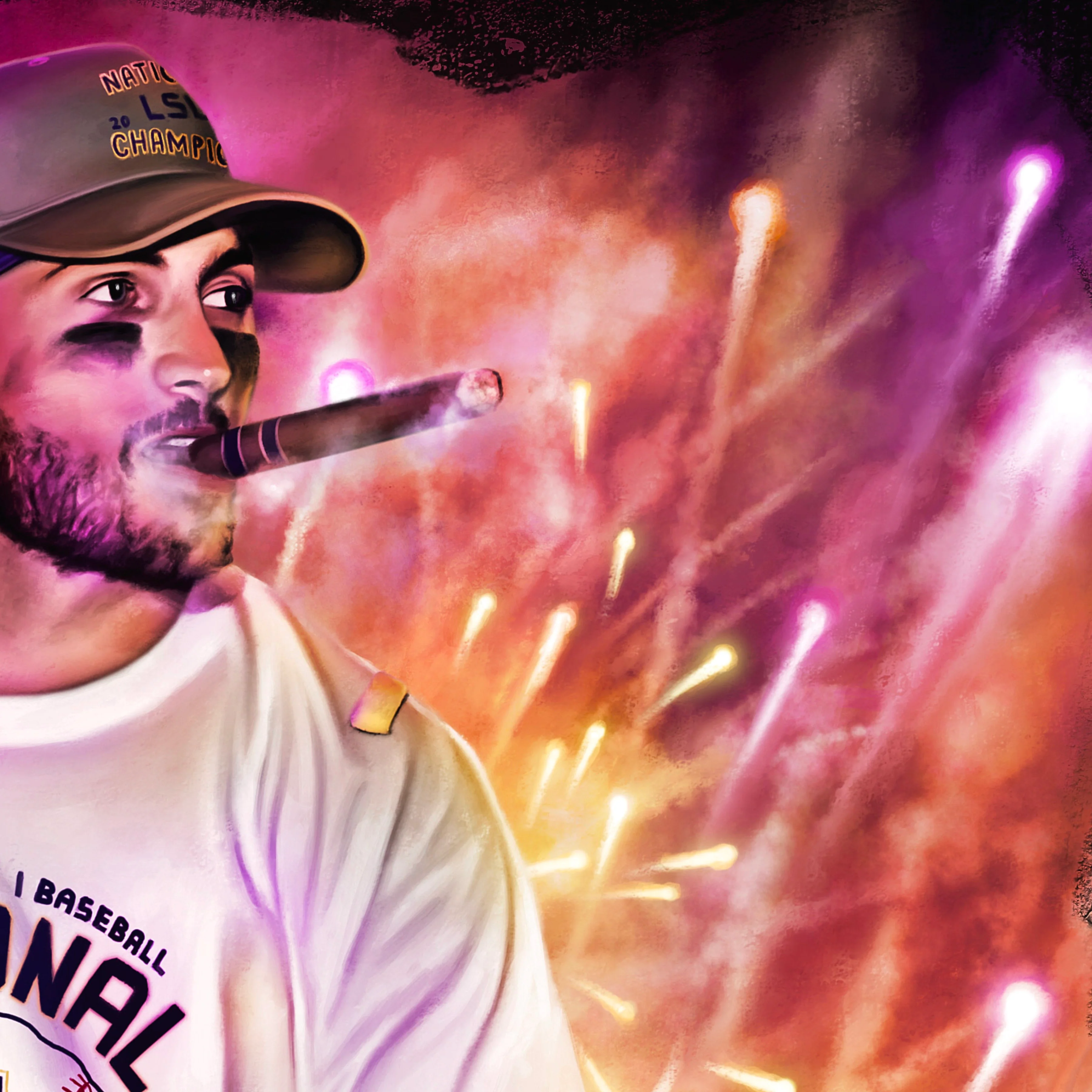 Of course, as fate would have it, Crews couldn’t end his victory without a celebratory cigar. In similar fashion to Joe Burrow, Crews knew exactly what he was creating. A moment worthy of being hung on the wall right next to Burrow. There are many details in this piece so look closely. In the background you can find the words “GEAUX TIGERS”, the number “7” and the iconic Alex Box Stadium. In the foreground you can find all the necessary hardware including the National championship trophy and Crews sporting his golden spikes and golden glove. Crews ended the season with quite the resume: 2023 SEC player of the year, 2023 Golden Spikes Award Winner, 2023 College Worlds Series All-Tournament Team, 2023 Golden Glove Winner, 2023 SEC Male Athlete Of The Year, and 2023 National Champion.