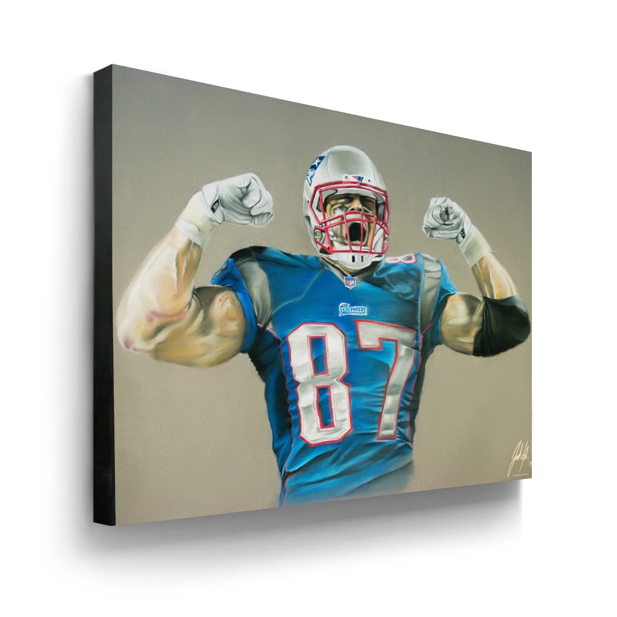 Gronk quickly established himself as one of the most dominate tight ends to ever play the game of football. Off the field Gronk is known to be a funny, energetic guy who like to have fun, but on the field Gronk knows how to flip the switch. At 6'7" Gronk turns into a monster every time he gets the ball usually requiring more than one defender to bring him down. This piece represents all that strength, power and intensity that Gronk brings to the game.