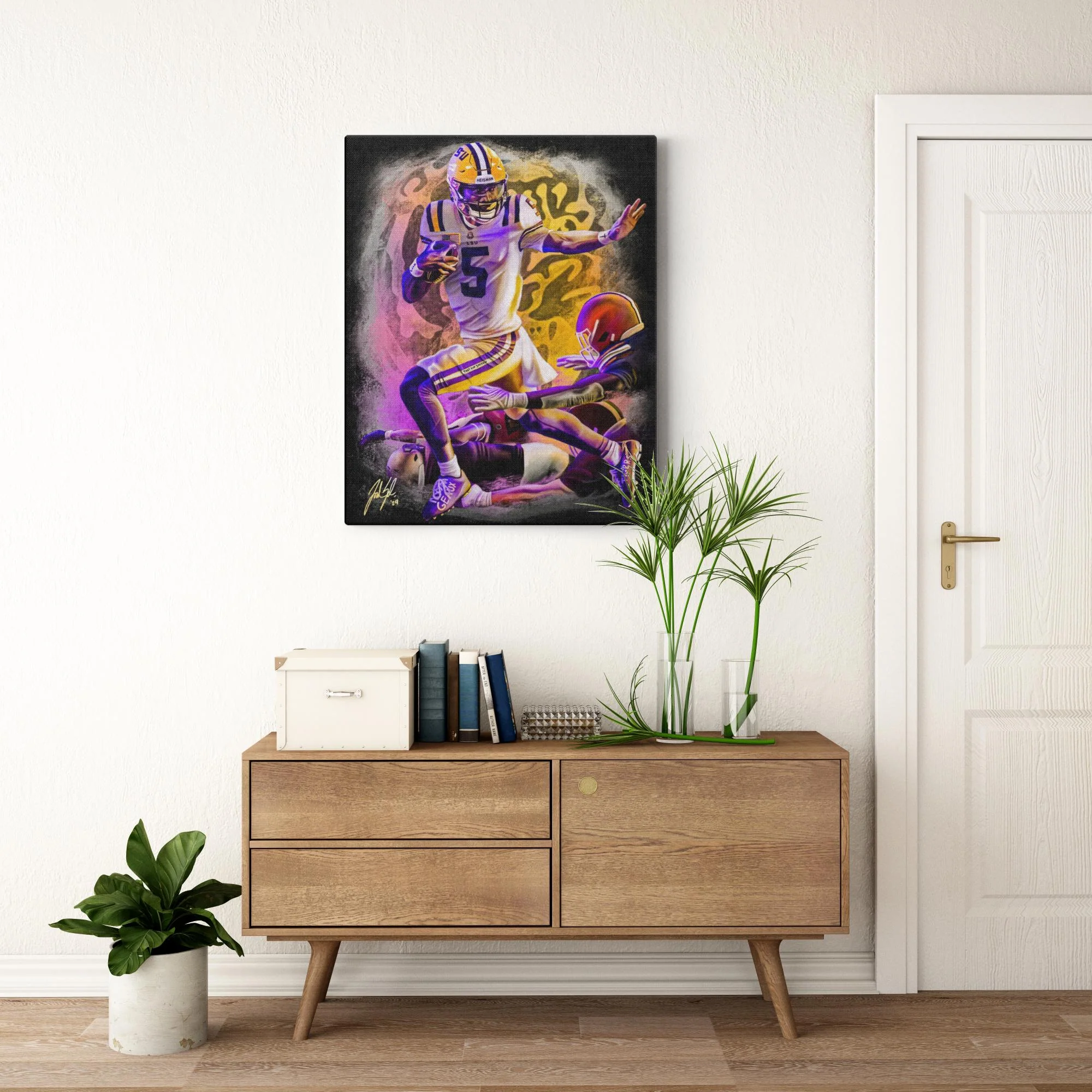 Lets take a closer look: Jayden Daniels is captured in an iconic football pose, embodying his Heisman Trophy status. The artwork also features opponents futilely attempting to tackle him, symbolizing his consistent on-field dominance. Detailed elements, such as "Heisman" on his helmet, wrist wrap markings, and "that kid Jayden" on his pants, provide a deeper narrative. The carefully chosen color scheme and background pay tribute to Tiger Nation, completing the visual story.